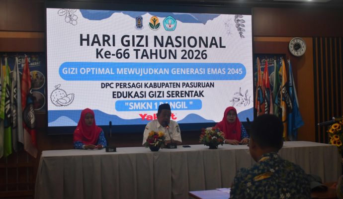 SMKN 1 Bangil memperingati Hari Gizi Nasional (HGN) ke-66 Tahun 2026 pada hari ini dengan mengusung tema “Gizi Optimal Mewujudkan Generasi Emas 2045”. Kegiatan ini dilaksanakan bekerja sama dengan DPC Persatuan Ahli Gizi Indonesia (Persagi) Kabupaten Pasuruan sebagai bentuk kepedulian sekolah terhadap pentingnya kesehatan dan pemenuhan gizi seimbang bagi peserta didik.